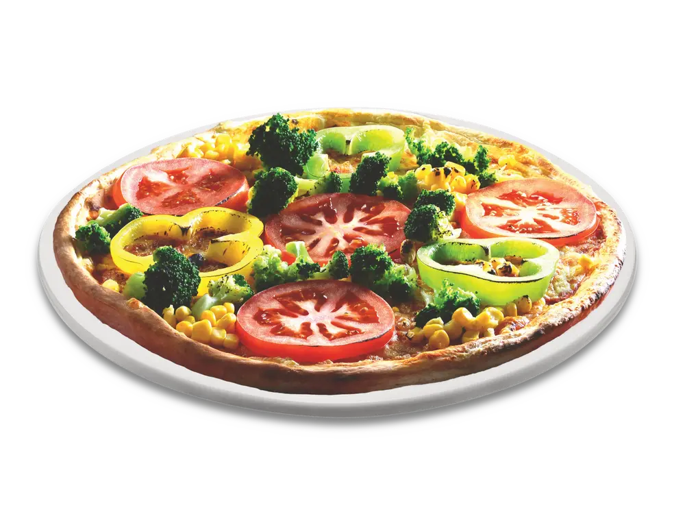 Frischer Teig, Tomatensauce, veganer Pizzaschmelz, Broccoli, Tomaten, Mais, Paprika